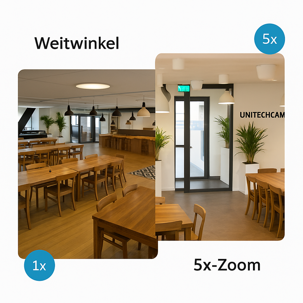 Unsere Kameras sind mit einem hochwertigen Zoomobjektiv ausgestattet, das es Ihnen ermöglicht, den gewünschten Bildausschnitt präzise einzustellen. Für den vollständigen Überblick lässt sich das Objektiv auf einen Weitwinkel von bis zu 112 Grad anpassen. Zudem bringt der 5-fache optische Zoom entfernte Details mühelos näher, während der Autofokus stets gestochen scharfe Bilder garantiert.